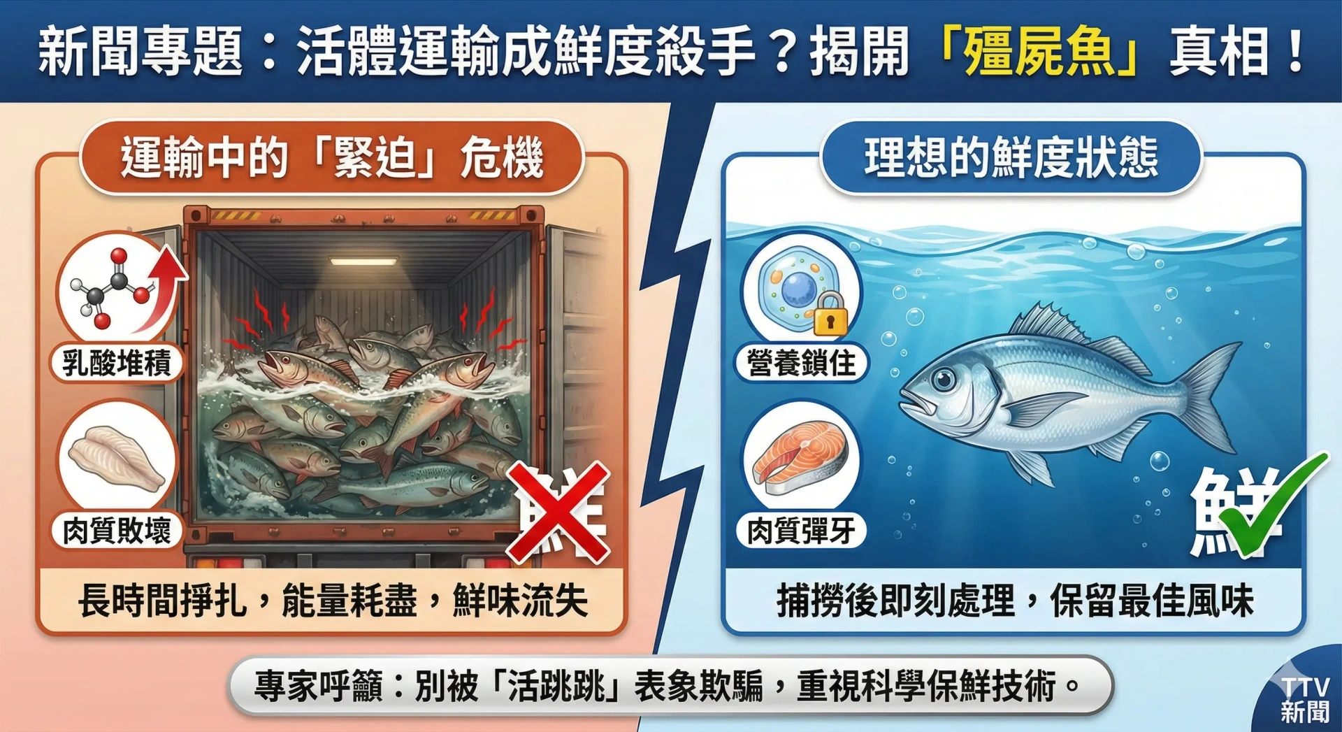 走進海鮮餐廳或傳統市場,看著水族箱裡游動的魚蝦,你是否覺得這就是「新鮮」的保證?台灣消費者普遍迷信「現撈尚青」,但食品與水產專家近日發出警語:若忽略了運輸過程中的「緊迫效應(Stress Response)」,你花大錢買到的活魚,可能只是虛有其表的「殭屍魚」,其肉質甚至不如專業的冷凍水產。